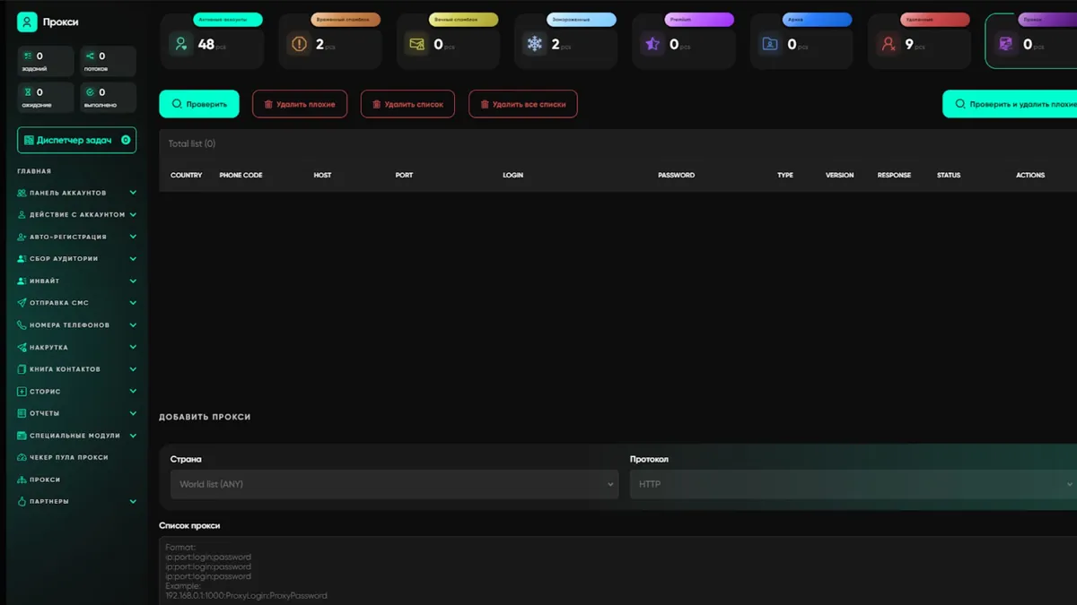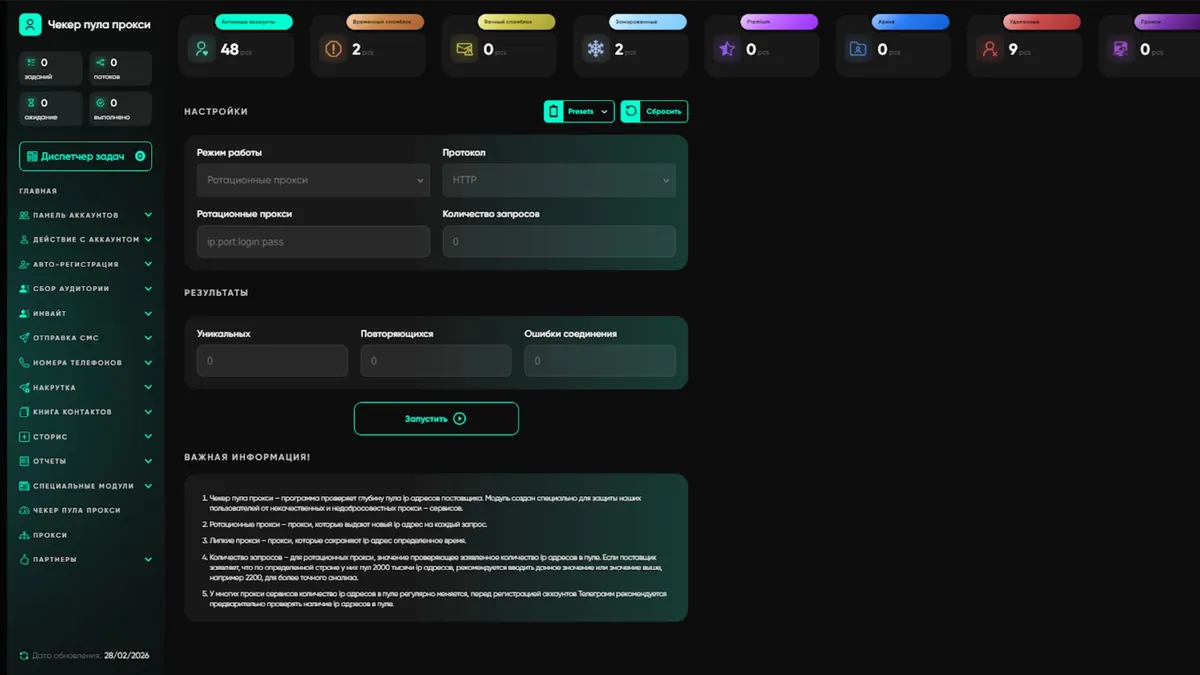 В Telegram Soft - Expert для этого есть отдельный модуль «Чекер пула прокси». Вы загружаете список, софт гоняет запросы и выдает статистику: сколько уникальных IP в пуле, сколько повторов и ошибок соединения. Это позволяет отсеять некачественных поставщиков еще до старта регистрации.