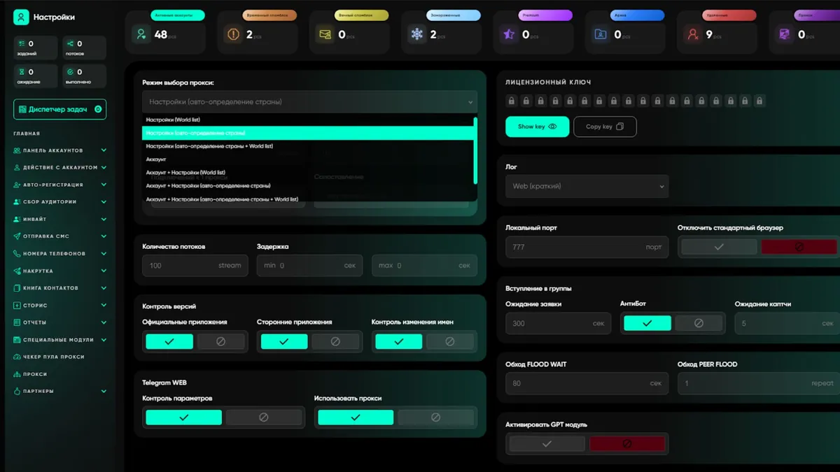 Telegram Soft - Expert позволяет замкнуть этот цикл в одном окне. Вам не нужно держать в голове десяток инструкций — софт сам распределит аккаунты по прокси, проверит их перед стартом и проведет регистрацию так, чтобы новые сессии не попали под фильтры.