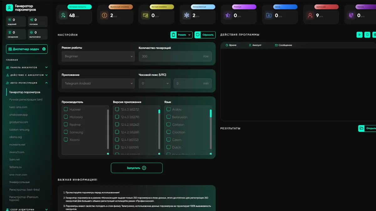 Перед регистрацией в модуле «Генератор параметров» создается база данных: какой аккаунт на каком прокси работает, какая версия API, устройство и т.д. Это эмуляция реального телефона, что критически важно для Anti-Spam систем Telegram.