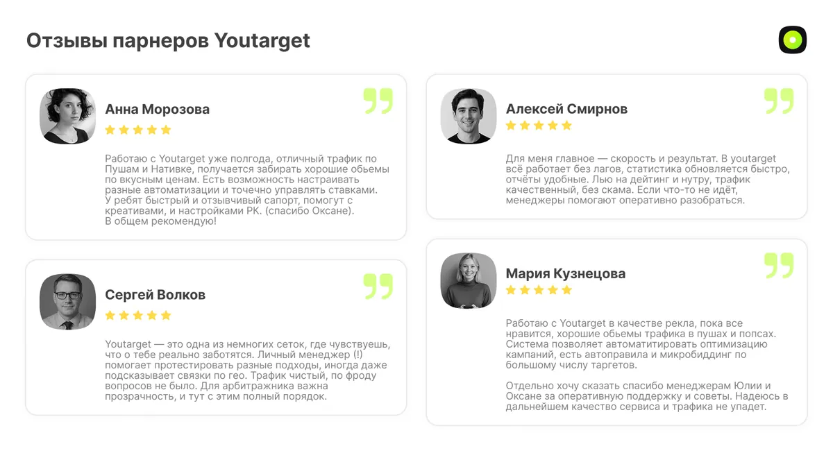 Youtarget предоставляет весь необходимый набор инструментов для стабильной работы: прямой трафик, сильные форматы, гибкие настройки, прозрачную аналитику и антифрод.