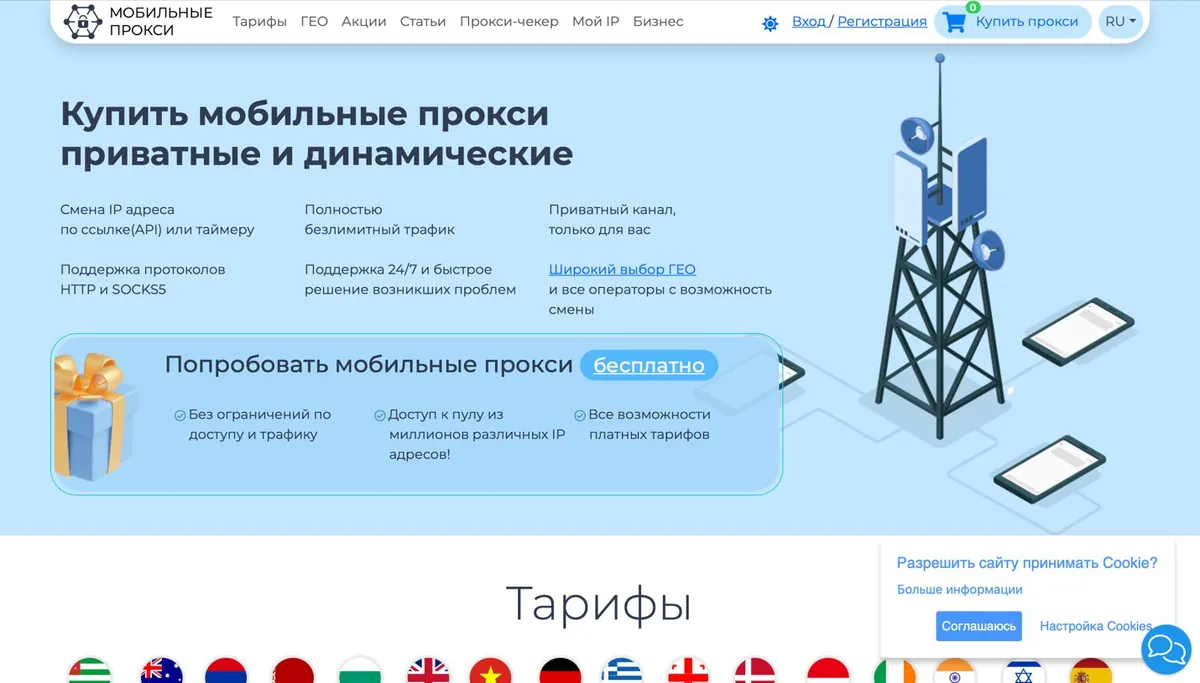 The service offers private mobile proxies (4G/5G) with dynamic IP rotation via API or timer. It supports 40+ countries and 180 mobile operators, allowing flexible geolocation targeting. IPs from real GSM operators look like traffic from regular users.