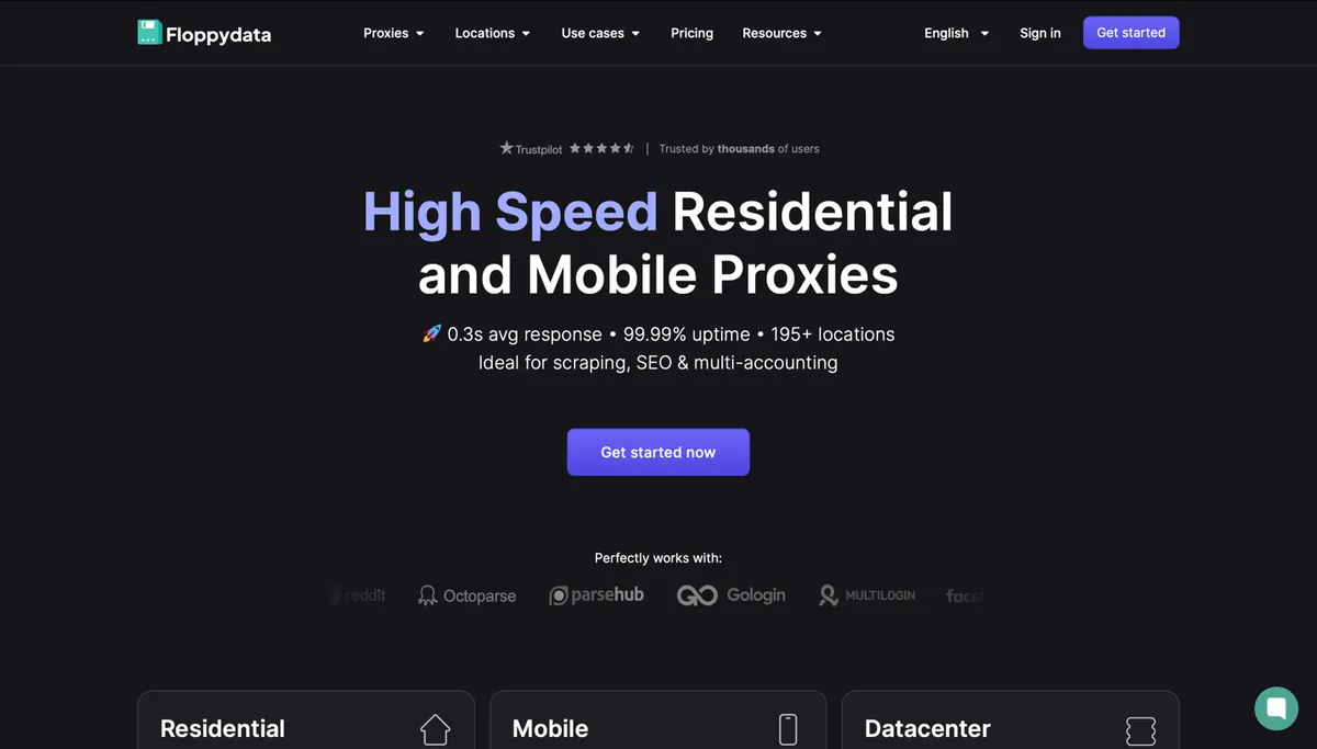 FloppyData is a premium proxy provider specializing in residential, mobile (4G/5G), and datacenter proxies. The service offers 65+ million IP addresses in 195+ countries, automatic rotation, fixed sessions, 99.99% uptime, and an average response time of 0.3 seconds.