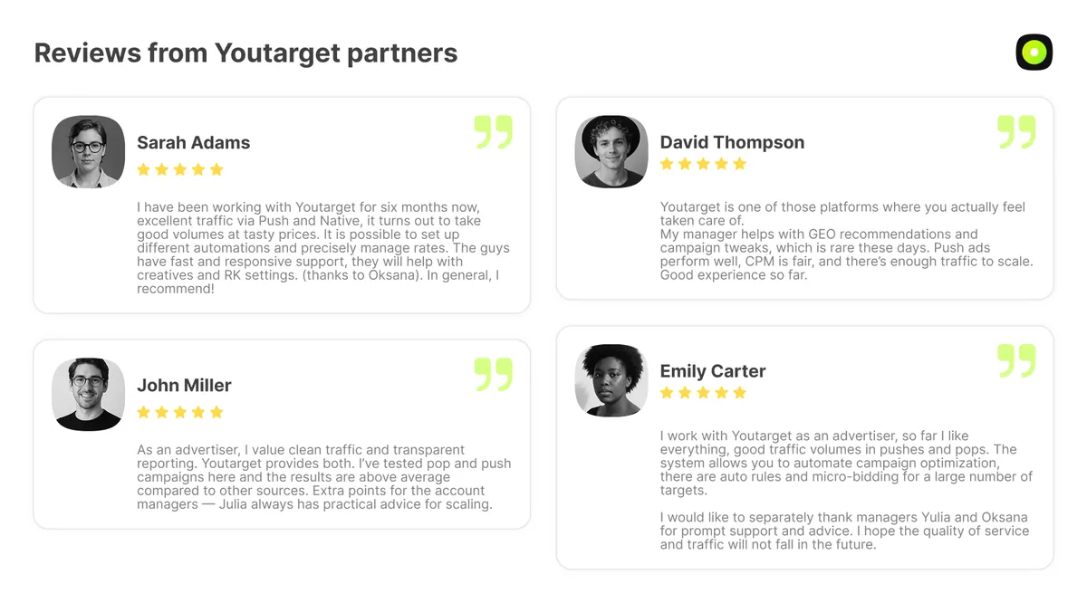 Youtarget provides all essential tools for successful affiliate campaigns: direct traffic, strong formats, flexible settings, performance tracking and a solid anti-fraud system. Advertisers save time on routine tasks, identify profitable zones faster, and scale campaigns with full control and visibility.